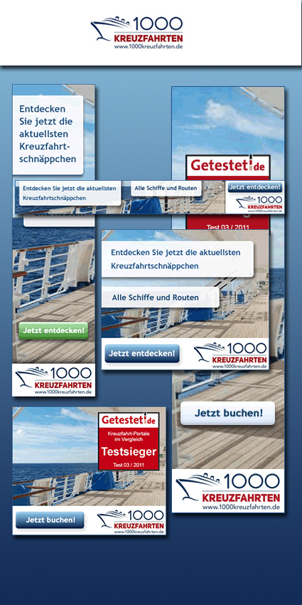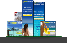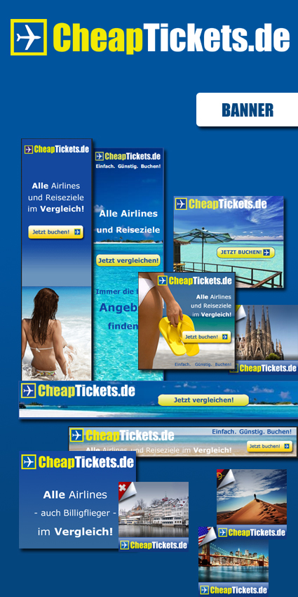 Diverse Online-Werbemittel in den gängigen Formaten (Skyscraper, Medium Rectangle, Leaderboard, etc.). Die Werbemittel wurden ohne direkte Vorgaben von mir entwickelt und zeigen verschiedene Angebote von cheaptickets.de.