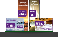 Diese interaktiven Web-Banner dienten der direkten Flug-, Mietwagen- oder Hotelsuche und wurden von mir designed und als iFrame programmiert in HTML programmiert und gehostet.