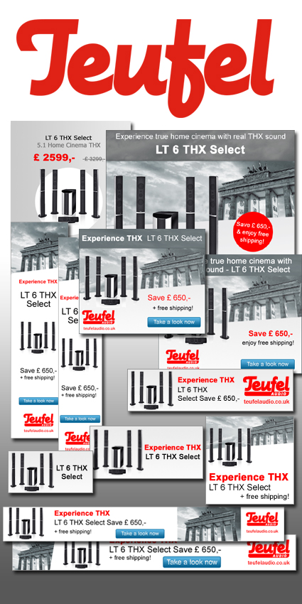 Diverse Online-Werbemittel in den gängigen Formaten (Skyscraper, Medium Rectangle, Leaderboard, etc.). Die Werbemittel wurden mit direkten Vorgaben von mir entwickelt und zeigen verschiedene Angebote von teufel.de.